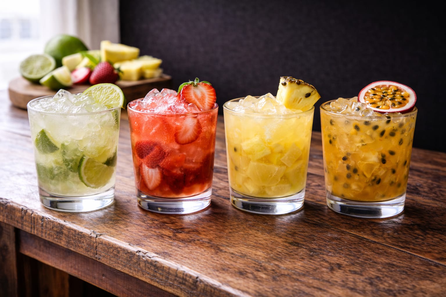 Caipirinhas Destilado, fruta, gelo e açúcar. (com e sem álcool)