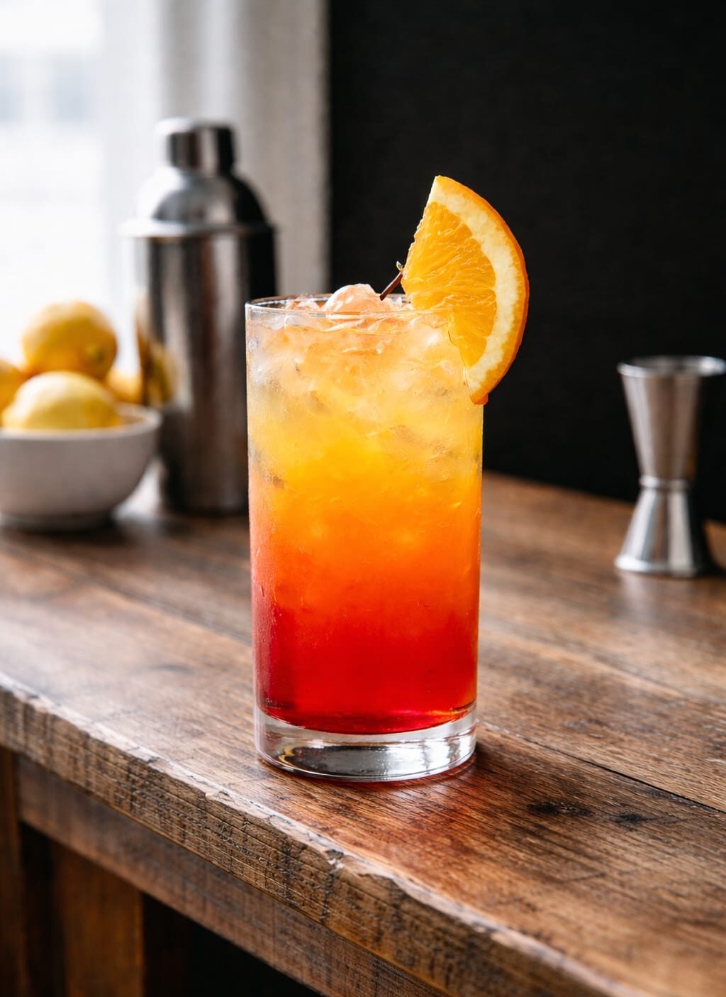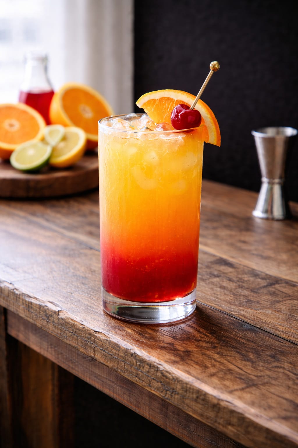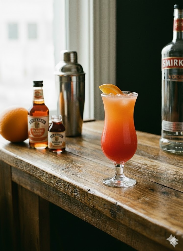 Suco de laranja, suco de pêssego e Grenadine.