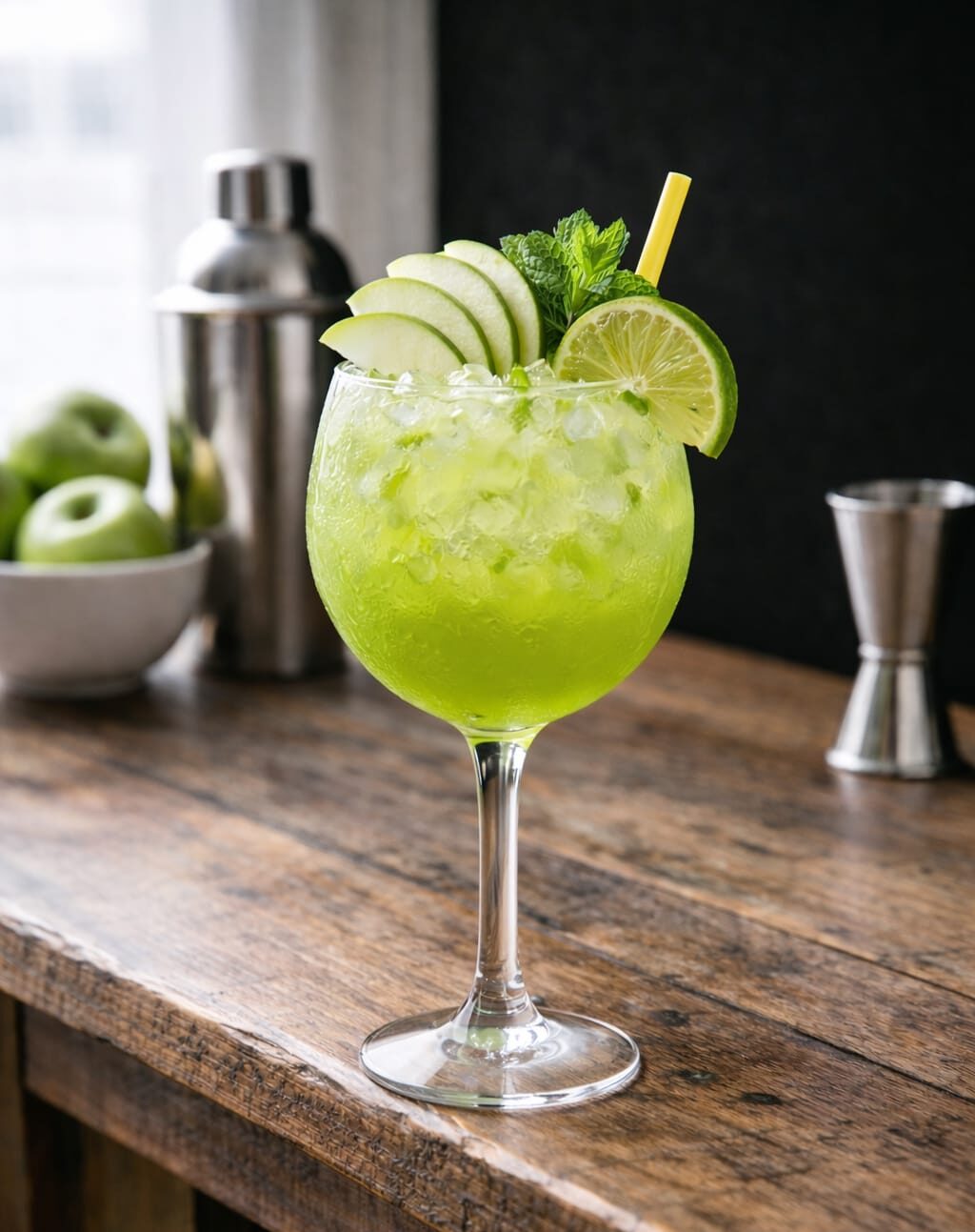 Gin, xarope de maçã verde e soda. (com e sem álcool)