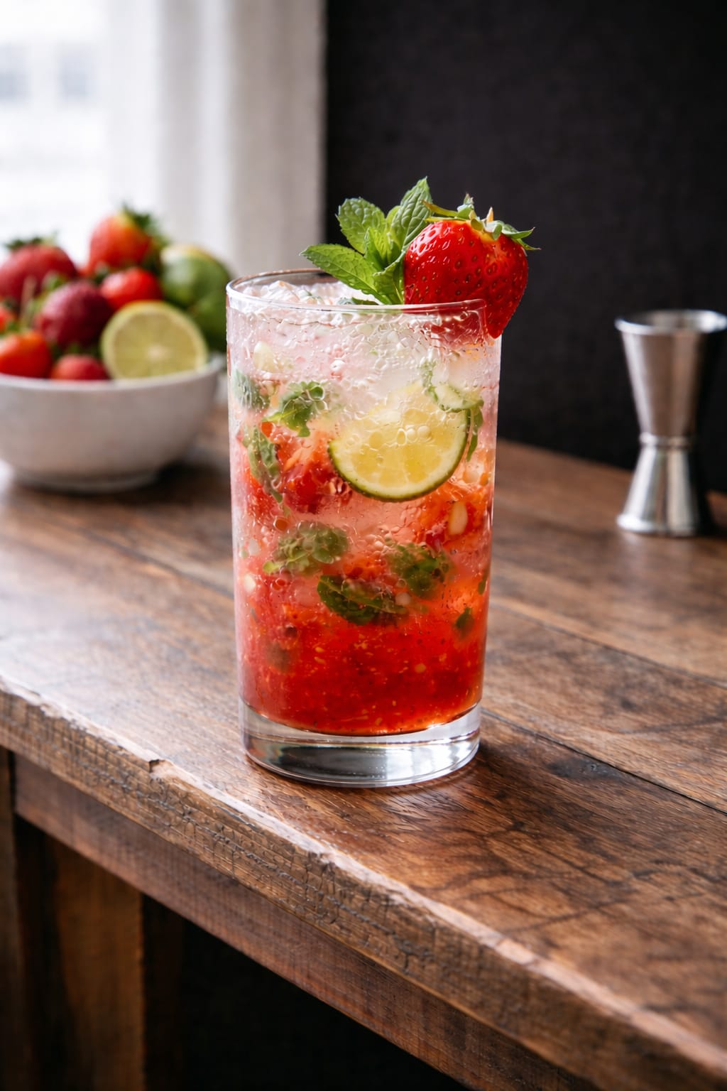 Morango amassado, limão espremido, açúcar ou xarope, hortelã, água com gás.