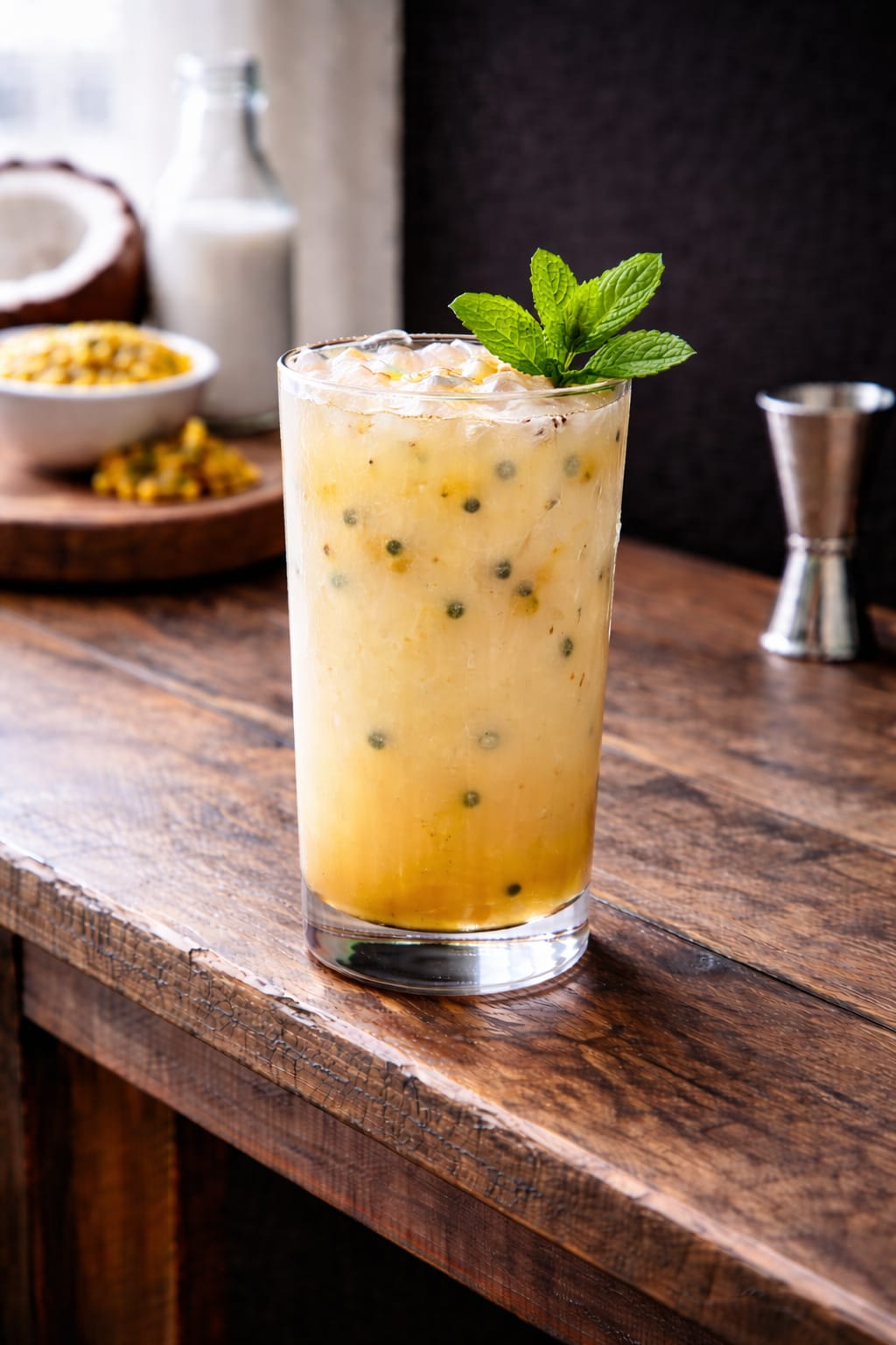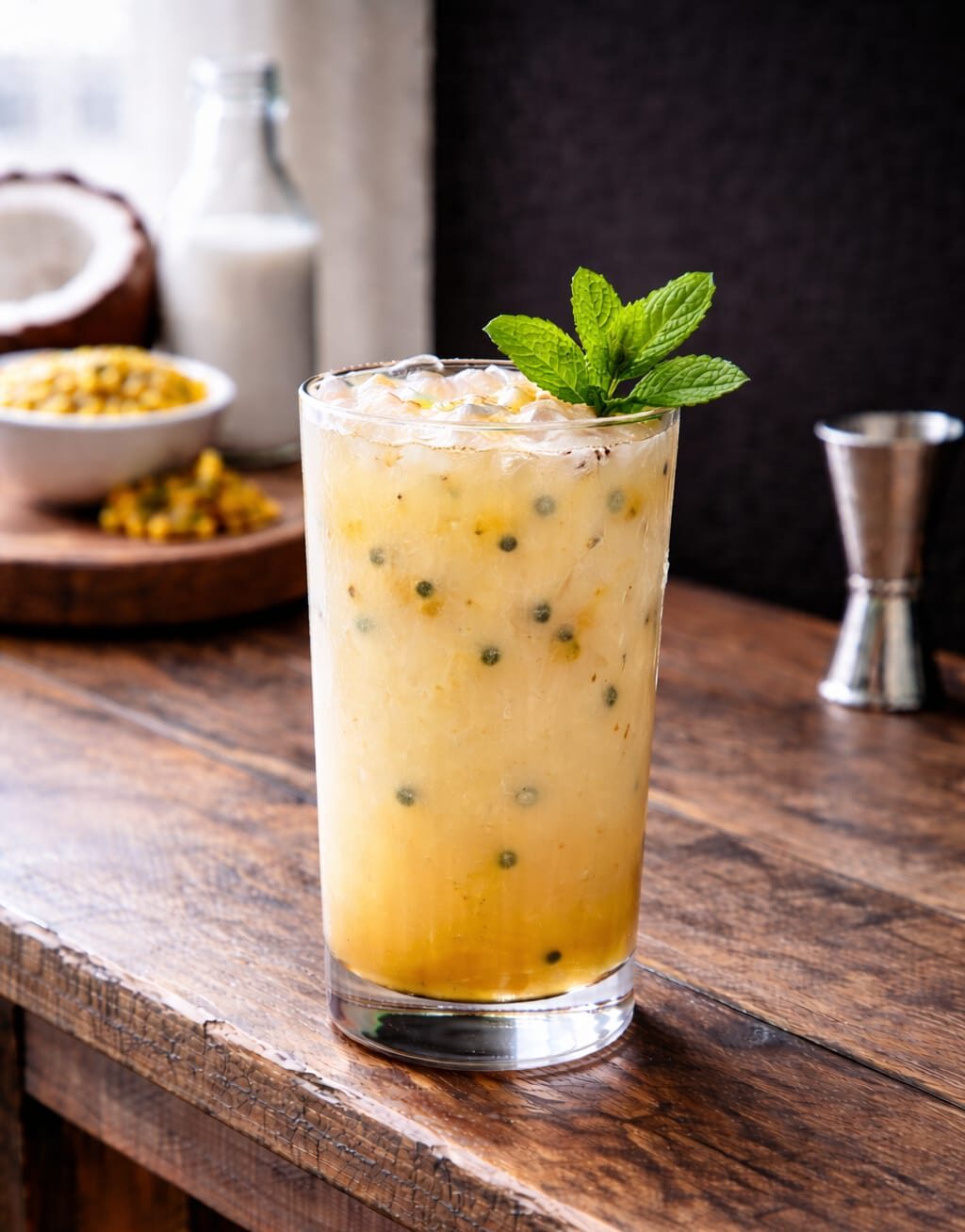 As batidas vai cachaça, leite condensado e maracujá.