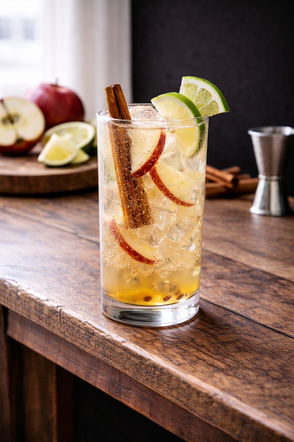 Suco de maçã, canela em pau, limão e água com gás.
