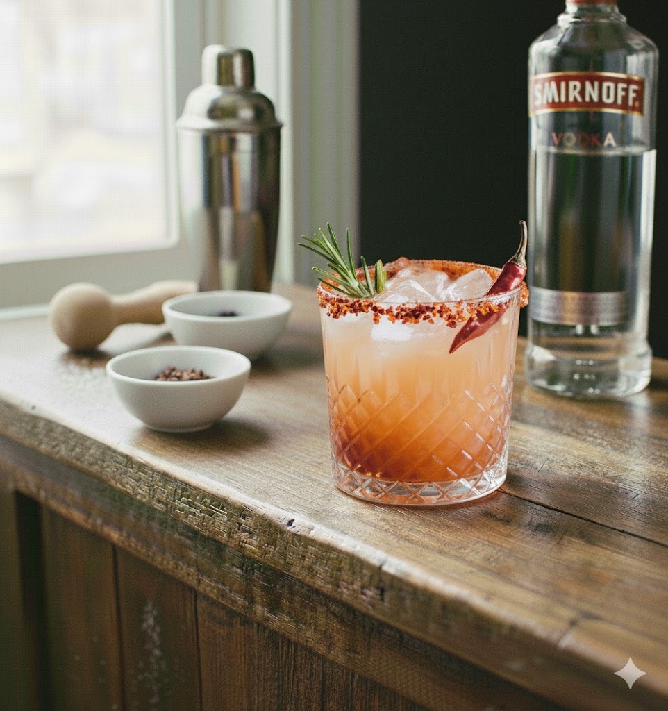 Gin, xarope de tangerina, xarope de açúcar, pimenta tabasco, tangerina e alecrim.